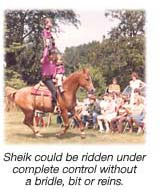 "Sheik did everything any other horse would do," recalls Johnny, "but completely without aid of a bridle or headgear." Their performances often displayed the trust between them, featuring Johnny riding Sheik with his then 21-month old daughter Rachael, or later with his 3-year old son Jonathan standing on his shoulders while Johnny rode Sheik at a gallop!